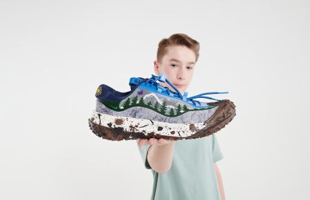 Garrett’s outdoorsy shoe is an ode to the Pacific Northwest, with a silhouette of Mt. Hood rising up behind the tree line and a waterfall…