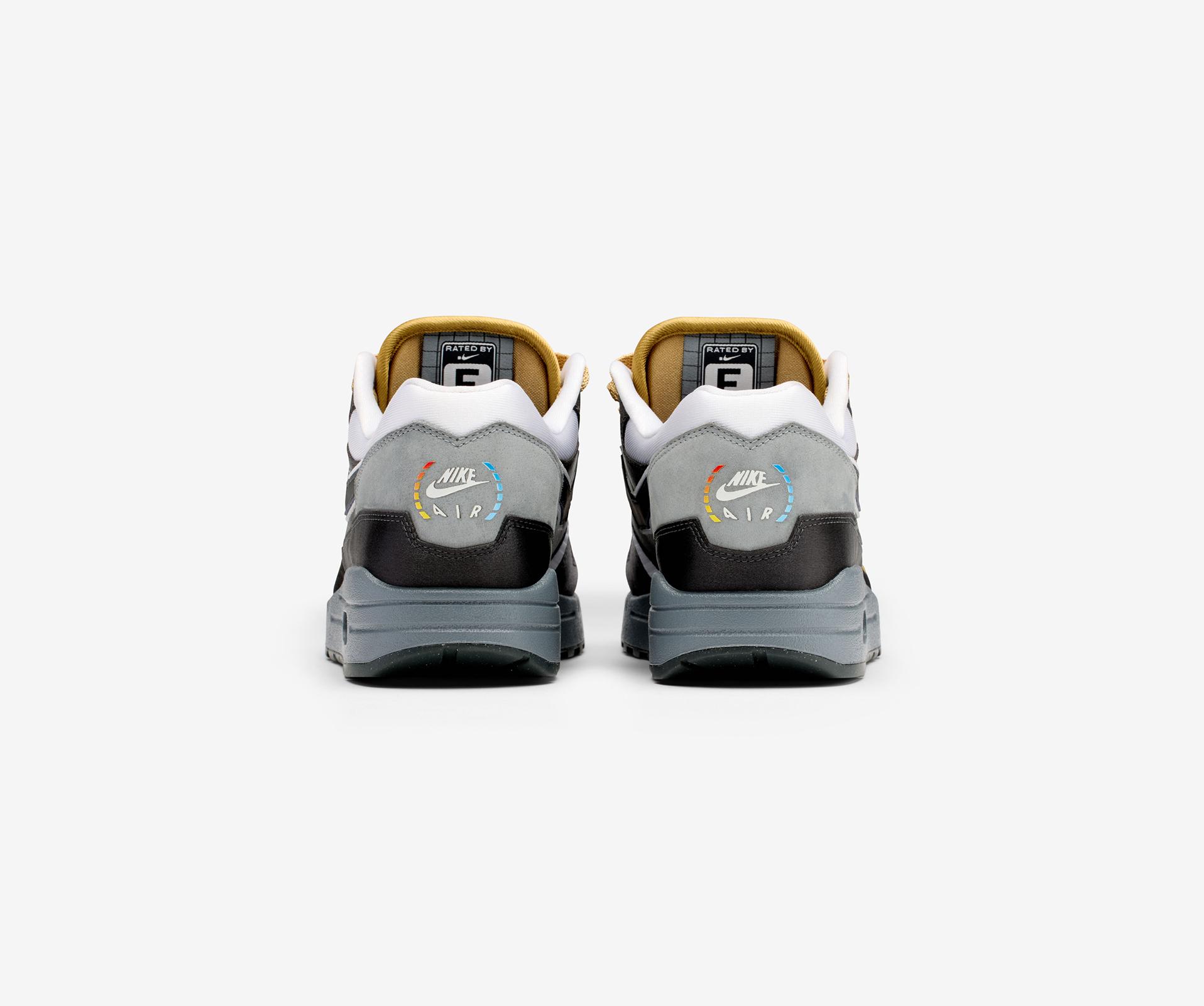The sneaker features a sleek black satin upper reminiscent of a classic Bond, James Bond, suit. Much like the “Big Head Origins”, the “Big Head Mode” Air Max 1 features several details around the sneaker that tie back to the iconic game. The AM1 tongue has been reengineered with extra padding for a luxurious feel- and to serve as a reminder to the character’s oversized heads. The insole features crosshairs, while a “Rated E” tag settles behind the tongue to remind us that Air Max is for everyone. Meanwhile the heel features abstract “Nike Air” branding that is encapsulated by lines symbolizing the health and armor bars that helped your character continue the fight within the game.