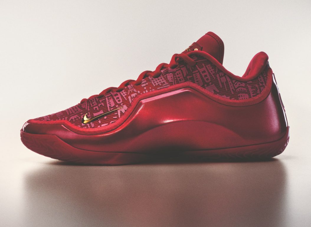 This rich red design of the sneaker takes its cues from the wine-colored cap Bron donned as he walked across that stage in 2003. The upper sports a graffiti-like graphic of New York’s unmistakable skyline with crowns throughout. And, naturally, there is an apple decal on the heel with a crown-shaped bite taken out of it.