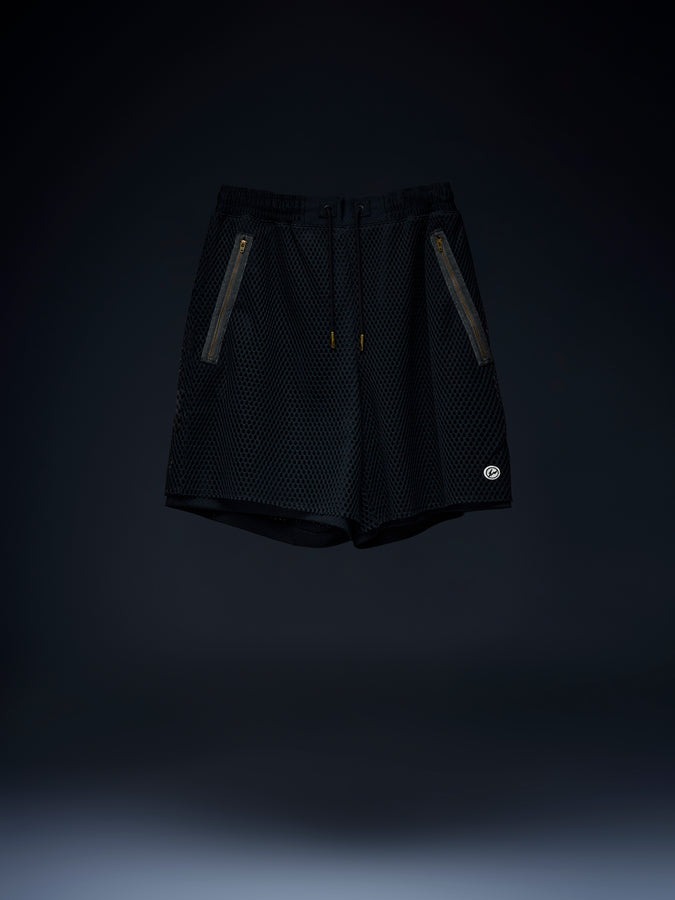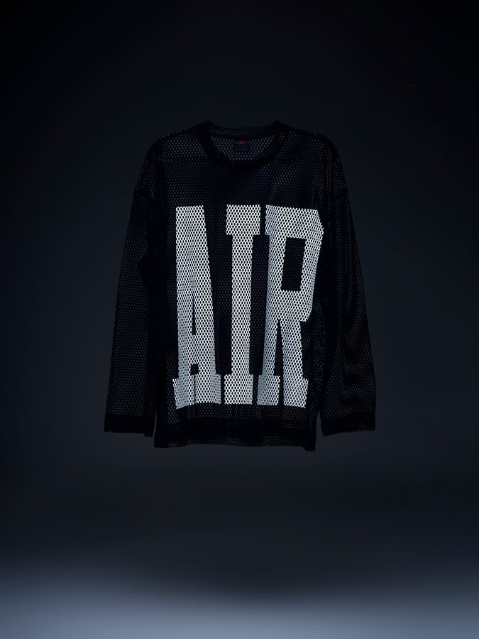 From an outerwear perspective, the apparel collection features a black hoodie with branding on the back. A long-sleeve jersey with giant “AIR” along the front of the jersey. Rounding out the collection is a pair of black mesh shorts with Fragment branding along the left front as well as zipper pockets.